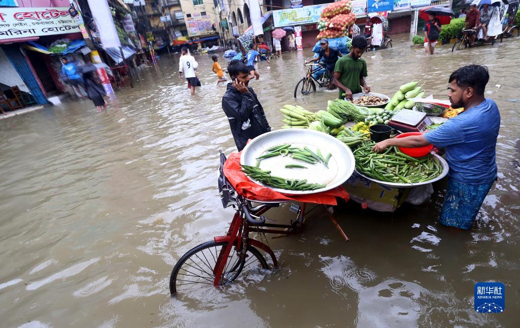8月6日,商販在孟加拉國吉大港一處積水的街區售賣(mài)蔬菜。