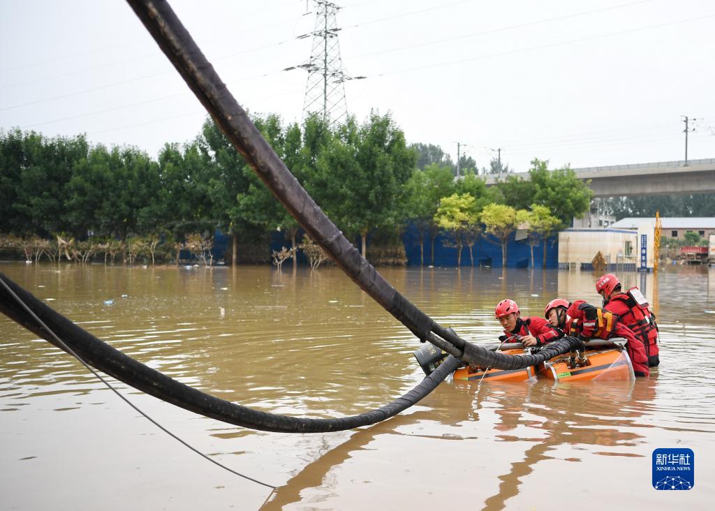 8月7日,唐山市消防救援支隊隊員在河北省涿州市市區內進(jìn)行排澇作業(yè)。