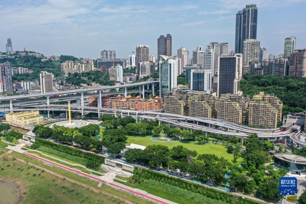 這是8月6日拍攝的位于重慶長(cháng)江岸邊的珊瑚公園一景(無(wú)人機照片)。
