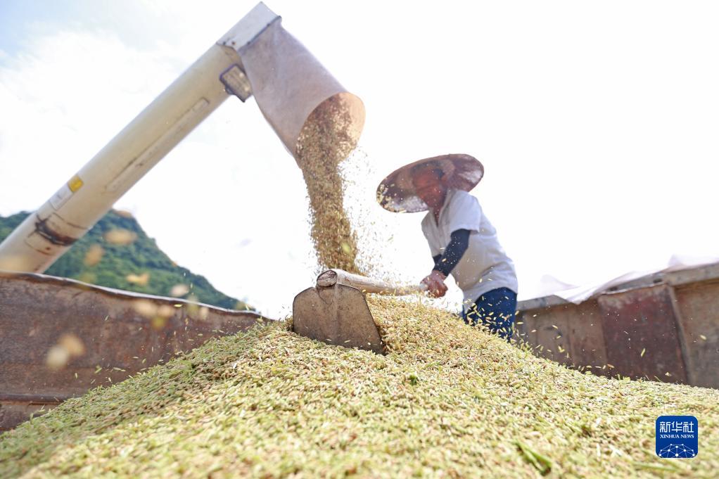 8月7日,在貴州省岑鞏縣注溪鎮六部屯村雜交水稻制種基地,村民在將收獲的水稻裝車(chē)。