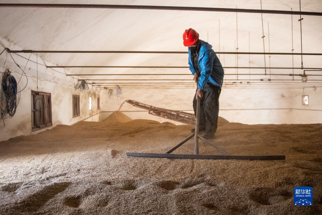 8月7日,在湖南安仁國家糧食儲備庫糧倉,工作人員在平整糧面。