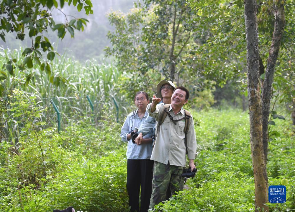 梁志章(右)、李文欽(中)和劉彥辰在觀(guān)察白頭葉猴活動(dòng)(8月5日攝)。