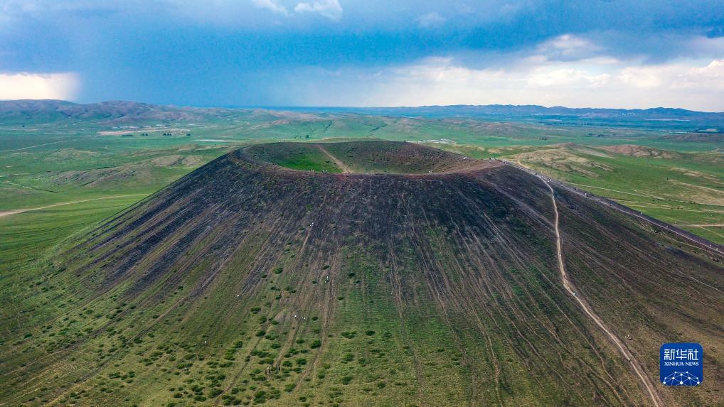 這是內蒙古烏蘭察布市察哈爾右翼后旗草原上的火山景觀(guān)(8月6日攝,無(wú)人機照片)。