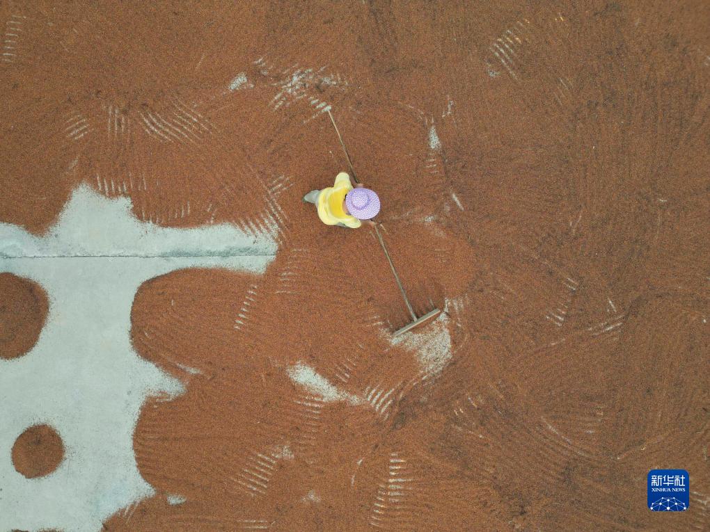 8月8日,貴州省遵義市余慶縣白泥鎮團結村村民在晾曬高粱(無(wú)人機照片)。