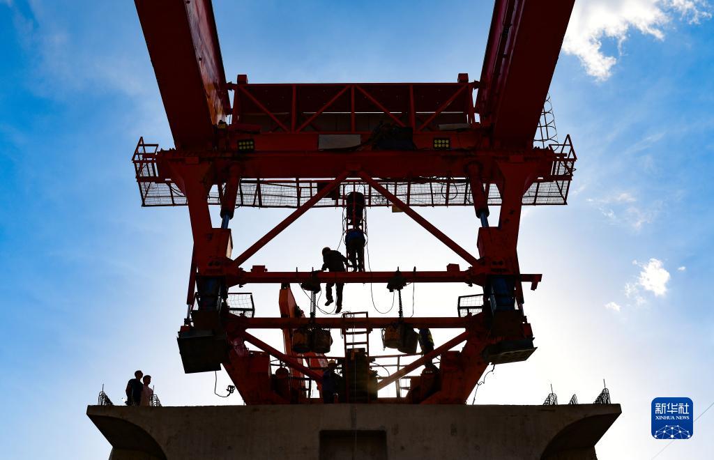 8月8日,建設者在包銀高鐵跨白彥花鐵路專(zhuān)用線(xiàn)特大橋箱梁架設施工現場(chǎng)作業(yè)。