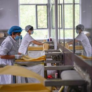 8月8日,在承德市雙灤區西地鎮一家豆片加工企業(yè),工人在生產(chǎn)線(xiàn)上擺放豆片。