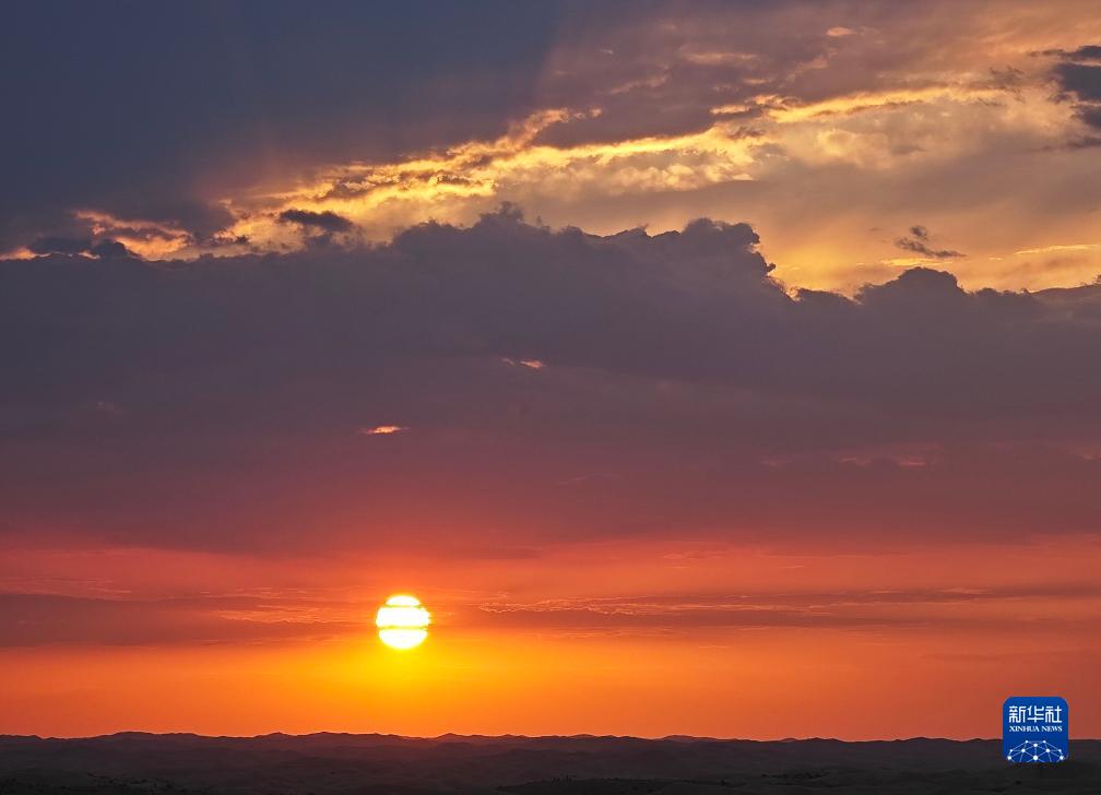 庫布其沙漠落日景觀(guān)(8月5日攝)。