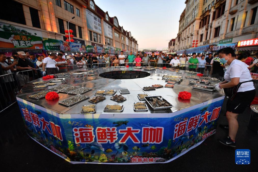 8月6日晚,在山東省青島市城陽(yáng)區舉行的首屆青島國際海鮮節活動(dòng)上,游客在參觀(guān)直徑6米的海鮮蒸鍋。