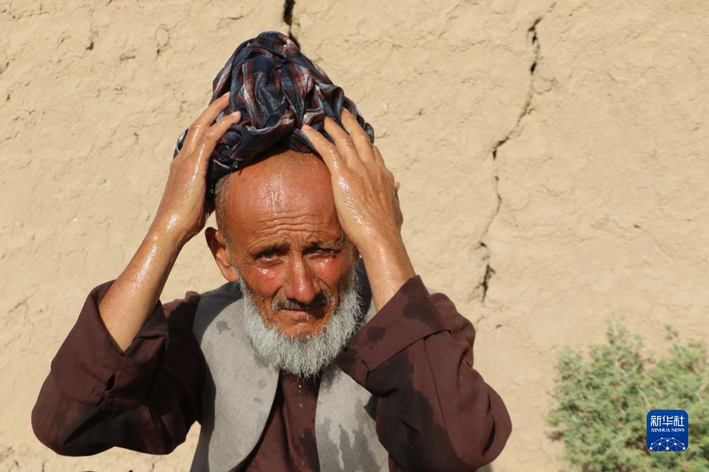 7月10日,在阿富汗朱茲詹省,一名男子用濕頭巾降溫。