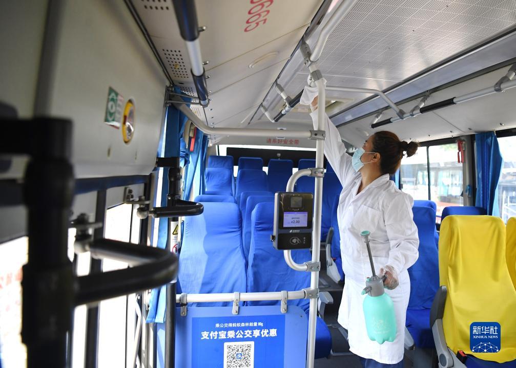 8月9日,河北省涿州市838路公交總站工作人員對車(chē)輛進(jìn)行消毒。