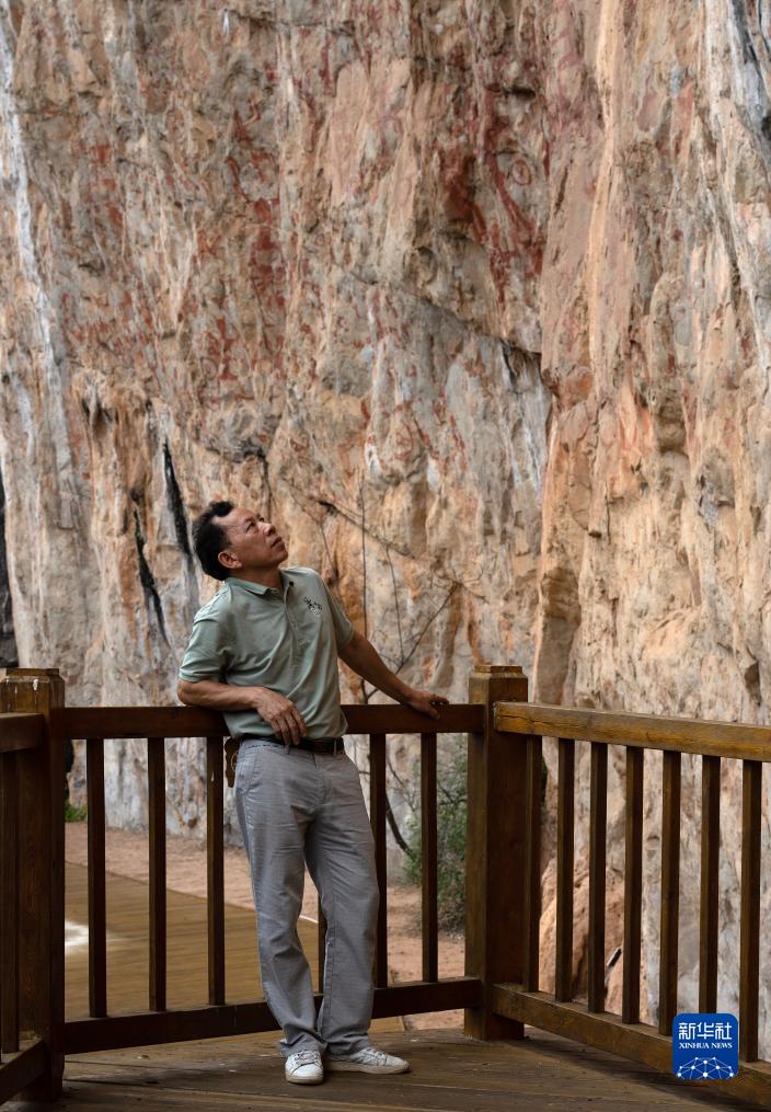 8月8日,廣西寧明縣文物管理所所長(cháng)朱秋平在觀(guān)察巖畫(huà)。