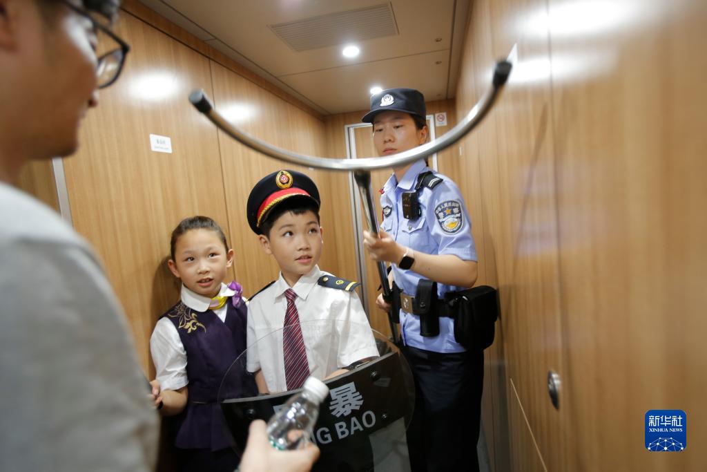 8月8日,南京鐵路公安處乘警支隊民警為小列車(chē)長(cháng)們介紹反恐演練器材。