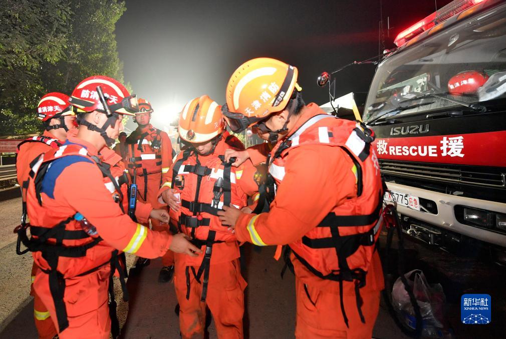 8月9日凌晨,在天津市靜海區臺頭鎮,天津消防救援總隊的消防員在巡查前互相整理裝備。