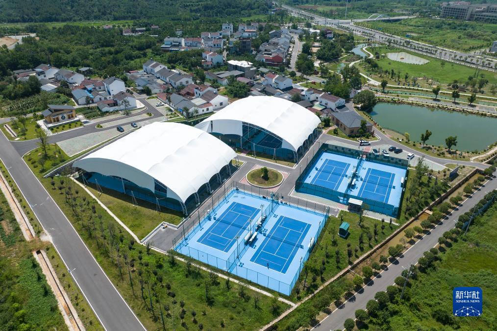 8月9日拍攝的京山文峰網(wǎng)球特色村網(wǎng)球訓練場(chǎng)(無(wú)人機照片)。