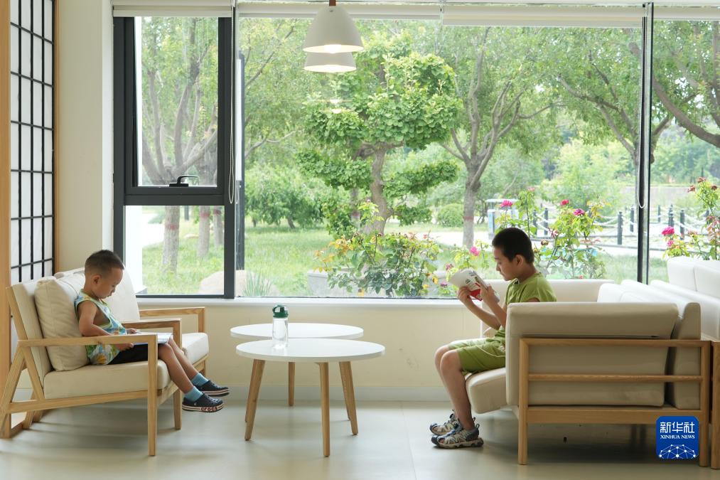 8月9日,小朋友在河北省石家莊市花卉園內一處公園書(shū)房閱讀。