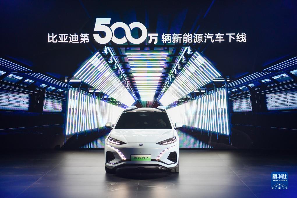 當日,比亞迪公司生產(chǎn)的第500萬(wàn)輛新能源汽車(chē)下線(xiàn)。新華社記者 梁旭 攝