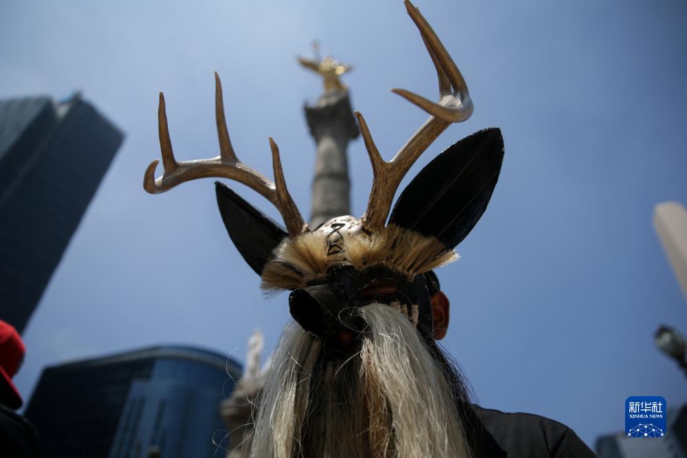 8月9日,在墨西哥首都墨西哥城,演員身著(zhù)傳統服飾參加世界土著(zhù)人民國際日慶?;顒?dòng)。