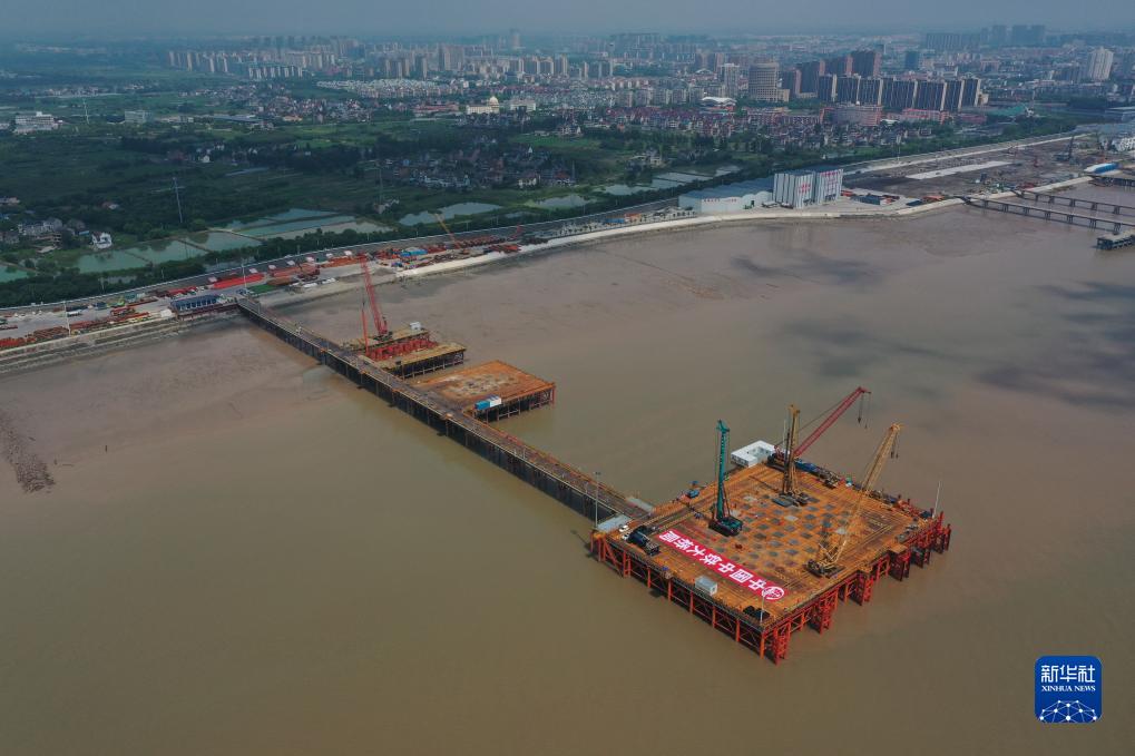 8月10日拍攝的杭州灣跨海鐵路橋北航道橋主塔墩鉆孔樁施工平臺(無(wú)人機照片)。