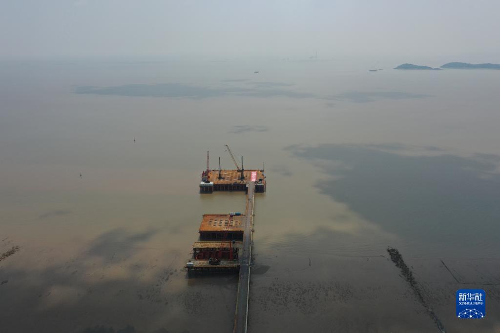 8月10日拍攝的杭州灣跨海鐵路橋施工平臺(無(wú)人機照片)。