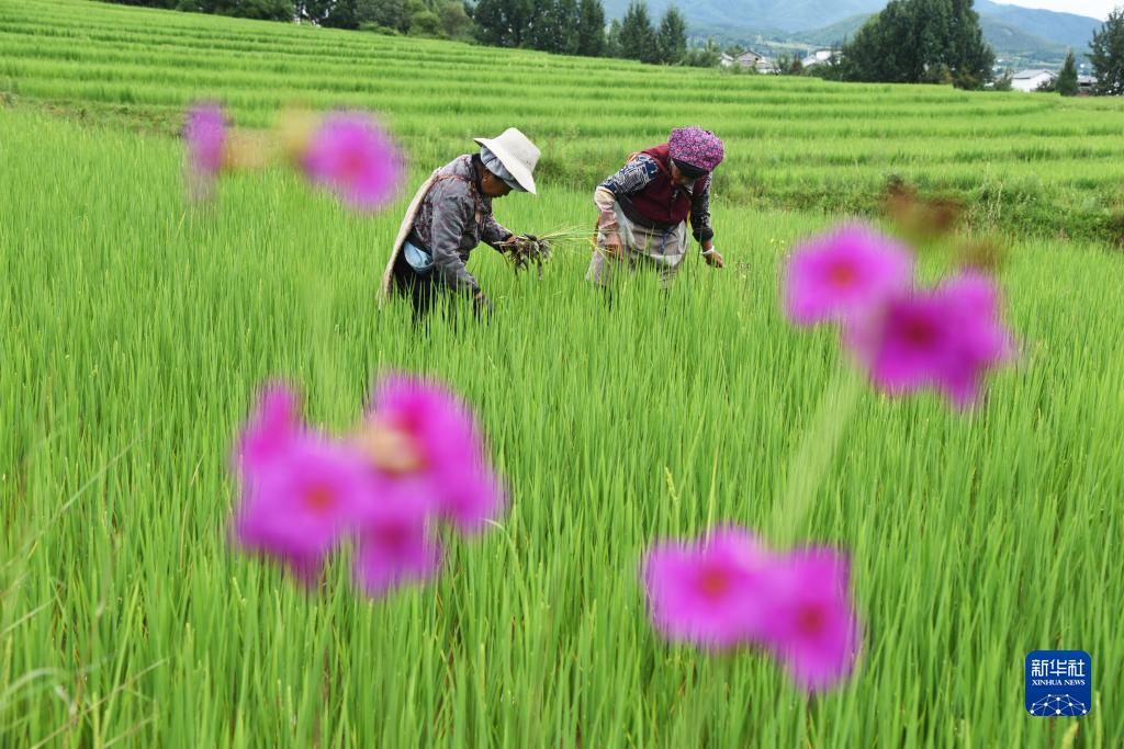 8月7日,在云南省大理白族自治州劍川縣馬登鎮文屏村,村民在水稻田里除草。
