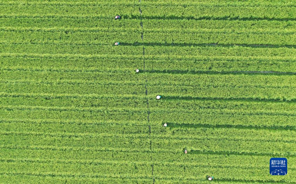 8月5日,四川省眉山市東坡區復興糧經(jīng)現代農業(yè)園區,村民在水稻制種田里開(kāi)展去雜作業(yè)(無(wú)人機照片)。