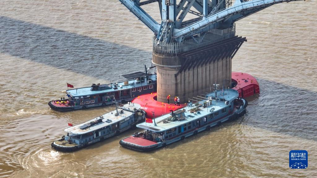 8月9日,中國鐵路上海局集團有限公司工作人員對南京長(cháng)江大橋橋墩防撞設施進(jìn)行安裝(無(wú)人機照片)。