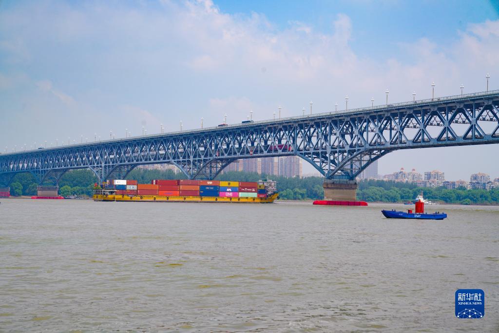 8月10日,一艘貨輪從南京長(cháng)江大橋橋墩旁通過(guò)。