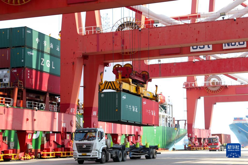 8月10日,在山東港口青島港,集裝箱貨車(chē)在裝載貨物。