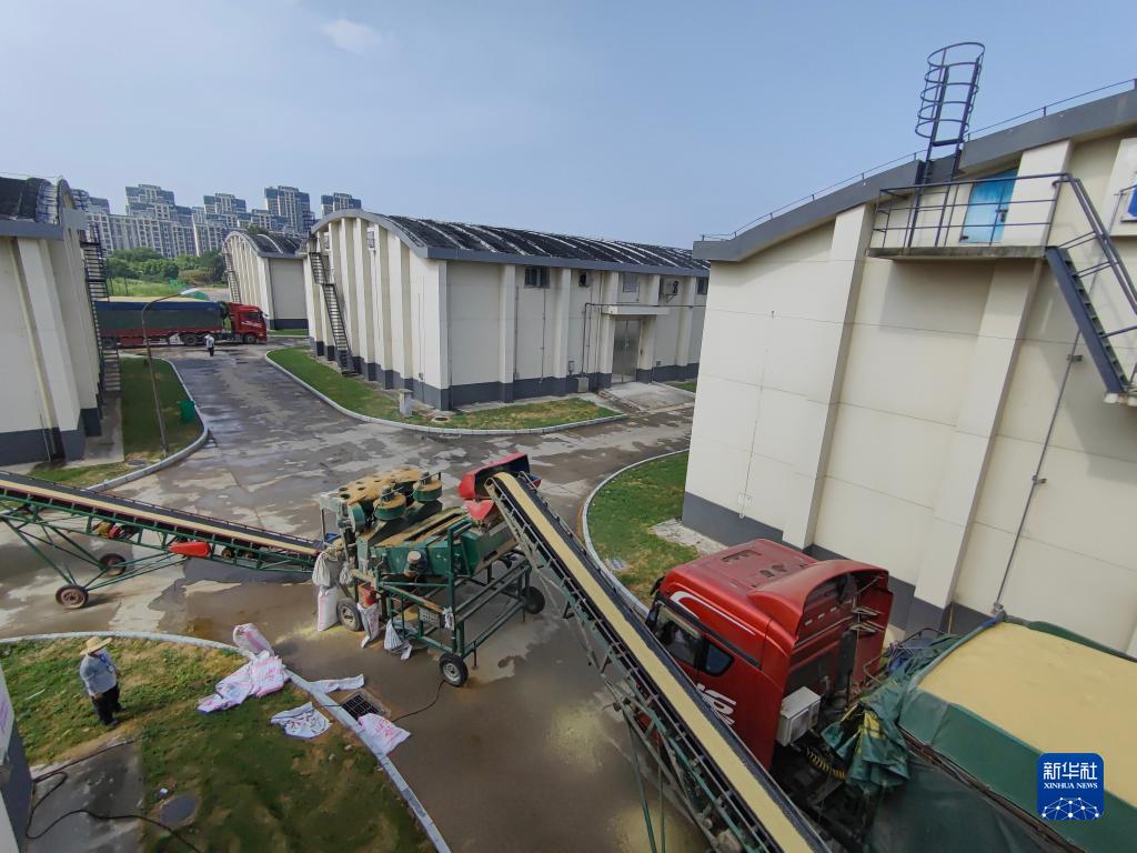 在江西省南昌縣橫崗國家糧食儲備庫,抽樣檢測合格的早稻通過(guò)傳送設備進(jìn)倉入庫(8月8日攝)。