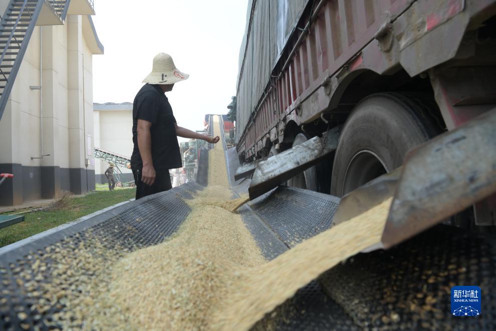 在江西省南昌縣橫崗國家糧食儲備庫,種糧大戶(hù)開(kāi)倉卸載糧車(chē)上的早稻(8月8日攝)。