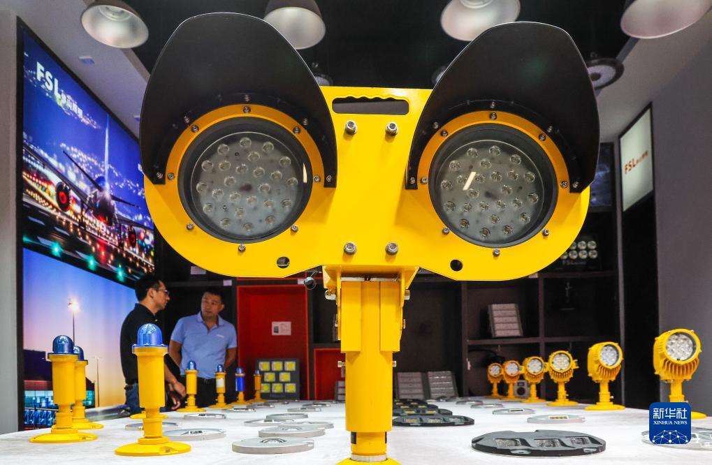 這是佛山照明產(chǎn)品展廳內展示的機場(chǎng)跑道照明設備(8月8日攝)。