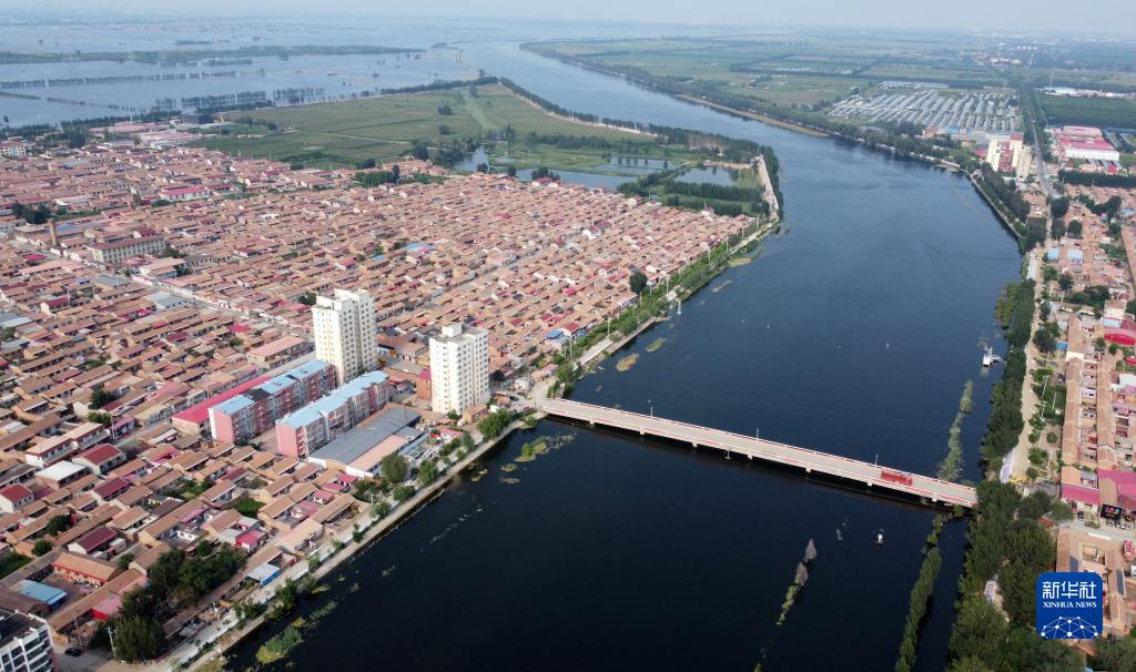 這是8月10日拍攝的大清河及堤北村莊(無(wú)人機照片)。