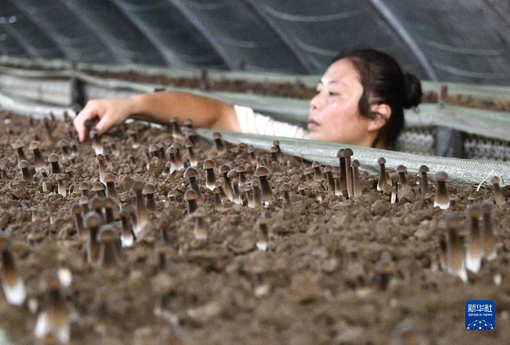 8月10日,在山東省菏澤市定陶區一處食用菌種植基地,工作人員在收獲成熟的黑皮雞樅菌。