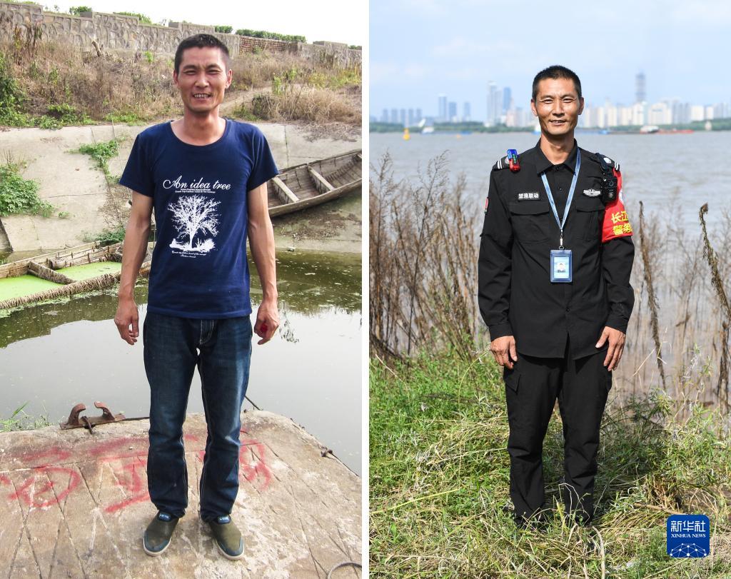 拼版照片:左圖為2016年,江蘇省南京市浦口區漁民楊金海在漁船上留影(資料照片);右圖為2023年7月18日,楊金海在浦口區的長(cháng)江邊留影(新華社記者 季春鵬 攝)。