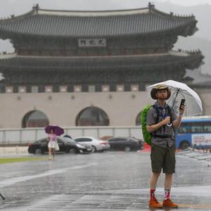 8月10日,游客撐傘走在韓國首爾光化門(mén)廣場(chǎng)。