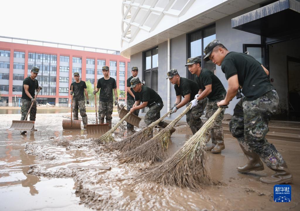 8月10日,武警河北總隊保定支隊戰士在涿州中學(xué)清淤。
