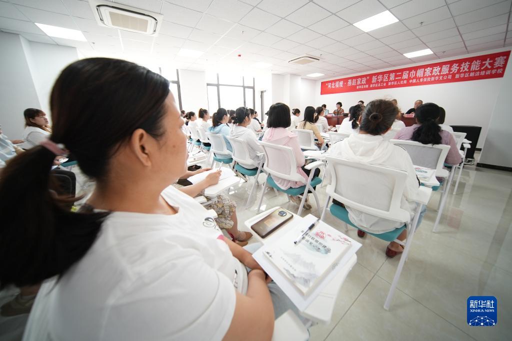 8月11日,在河北省滄州市新華區巾幗家政服務(wù)大賽比賽現場(chǎng),工作人員講解比賽規則。