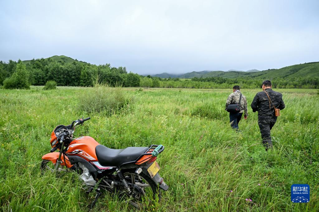 8月4日,白巴嘎那(左)和同事走在內蒙古扎魯特旗罕山國家級自然保護區內。