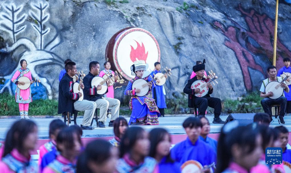 演員在威寧彝族回族苗族自治縣火把節活動(dòng)上演奏月琴(8月10日攝)。