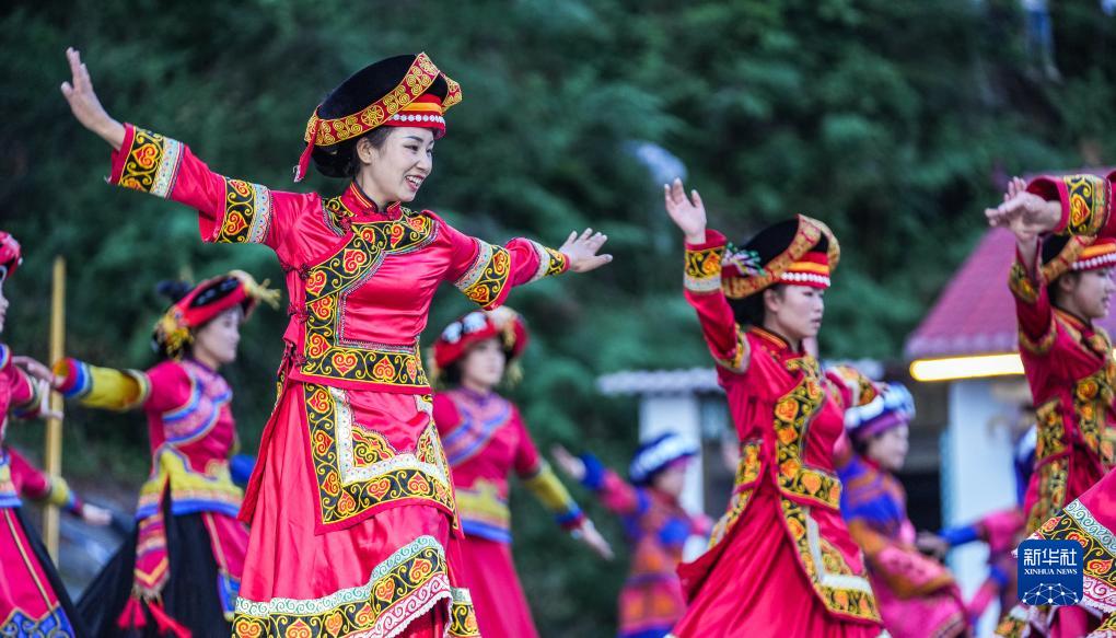 演員在威寧彝族回族苗族自治縣火把節活動(dòng)上表演撒麻舞(8月10日攝)。