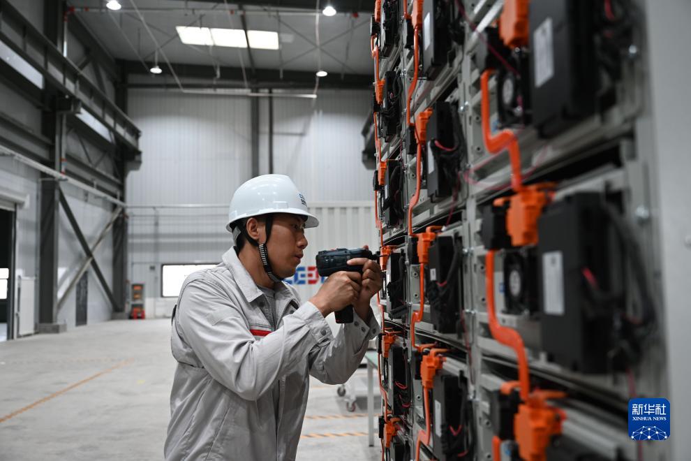 8月10日,工人在葛洲壩(甘肅)能源科技有限公司組裝電化學(xué)儲能裝置。