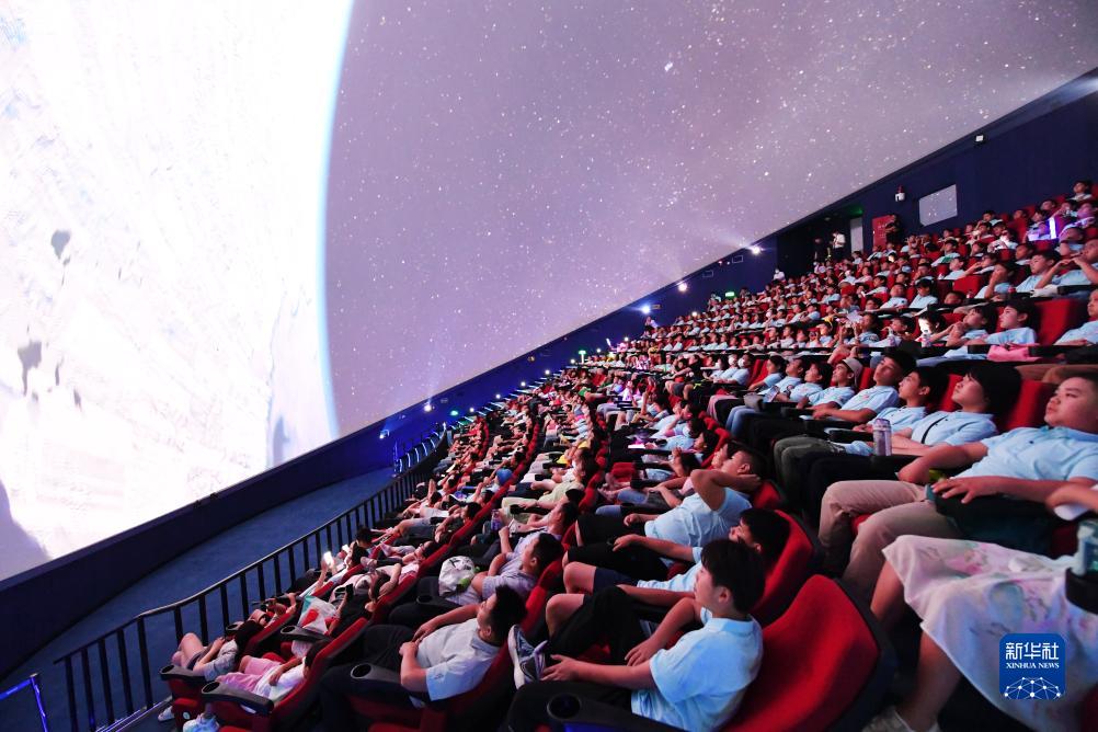 8月10日,夏令營(yíng)學(xué)生在河南省科技館“科學(xué)之夜”活動(dòng)中觀(guān)看球幕電影。