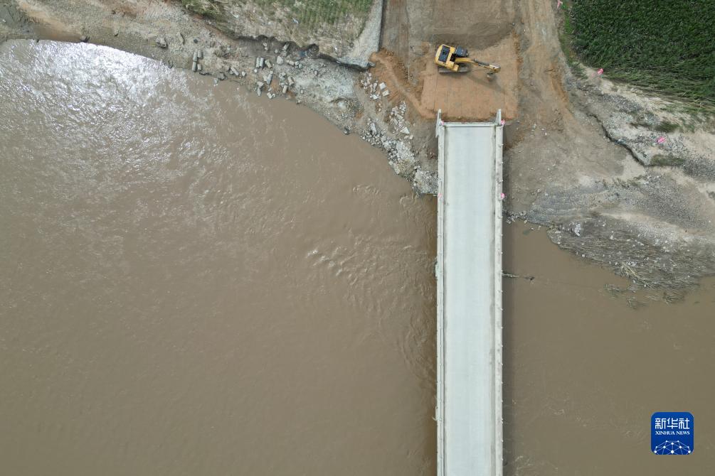 8月11日,工作人員在黑龍江省尚志市馬延鄉馬延大橋搶修現場(chǎng)進(jìn)行施工作業(yè)(無(wú)人機照片)。