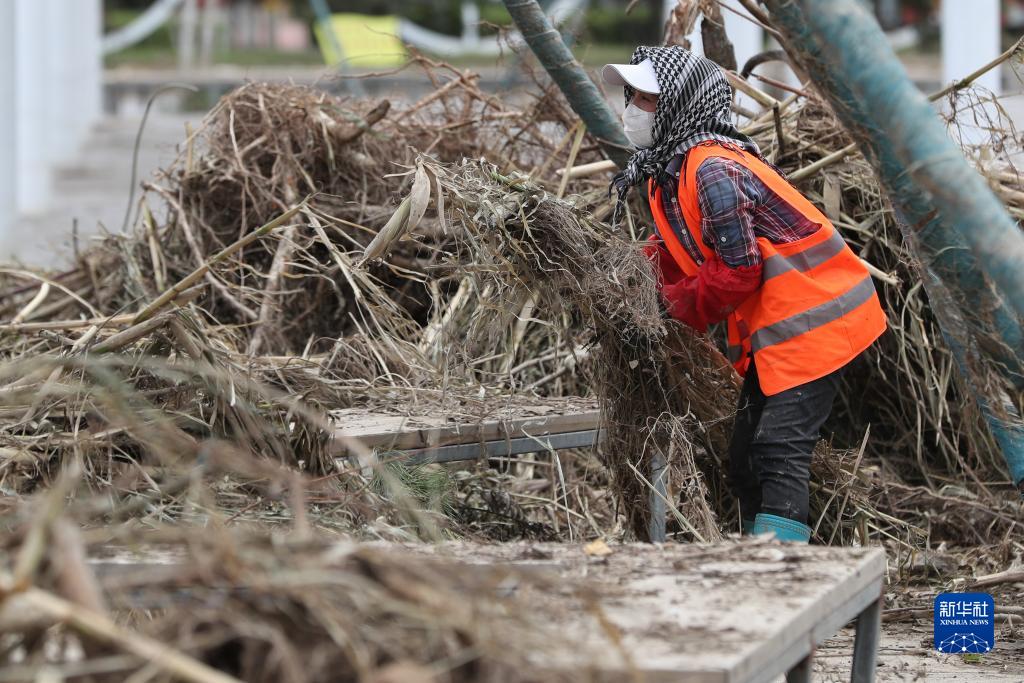 8月11日,在黑龍江省尚志市尚志大街附近,環(huán)衛工人在清理洪水沖來(lái)的雜物。
