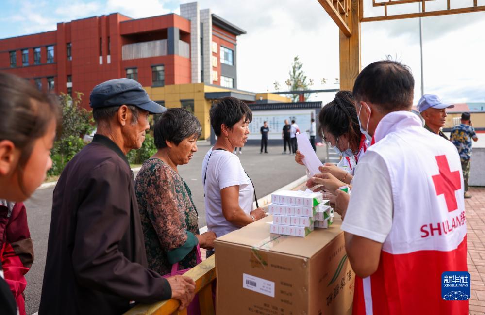 8月11日,居民在吉林省舒蘭市舒蘭三中居民安置點(diǎn)領(lǐng)取舒蘭市紅十字會(huì )發(fā)放的藥品物資。