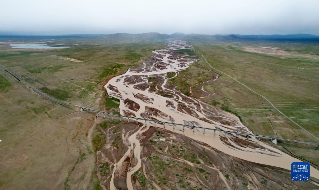 青藏鐵路跨過(guò)尕爾曲的辮狀河道(7月27日攝,無(wú)人機照片)。
