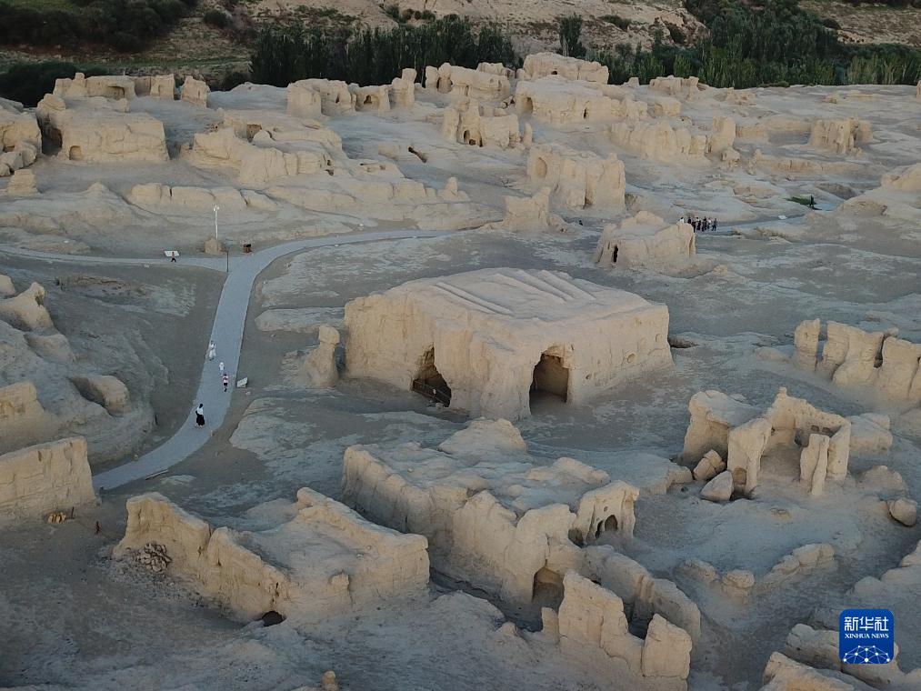 8月11日,游客游覽交河故城(無(wú)人機照片)。