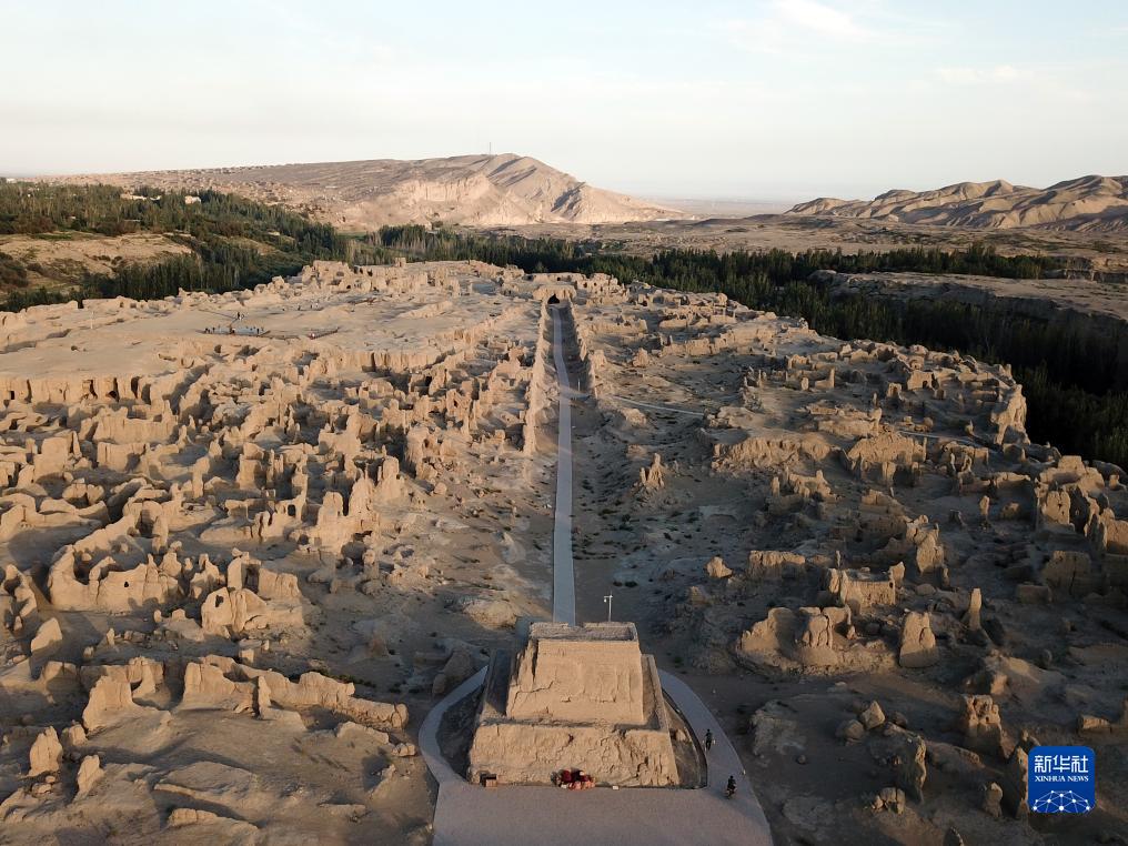 8月11日拍攝的夕陽(yáng)下的交河故城(無(wú)人機照片)。