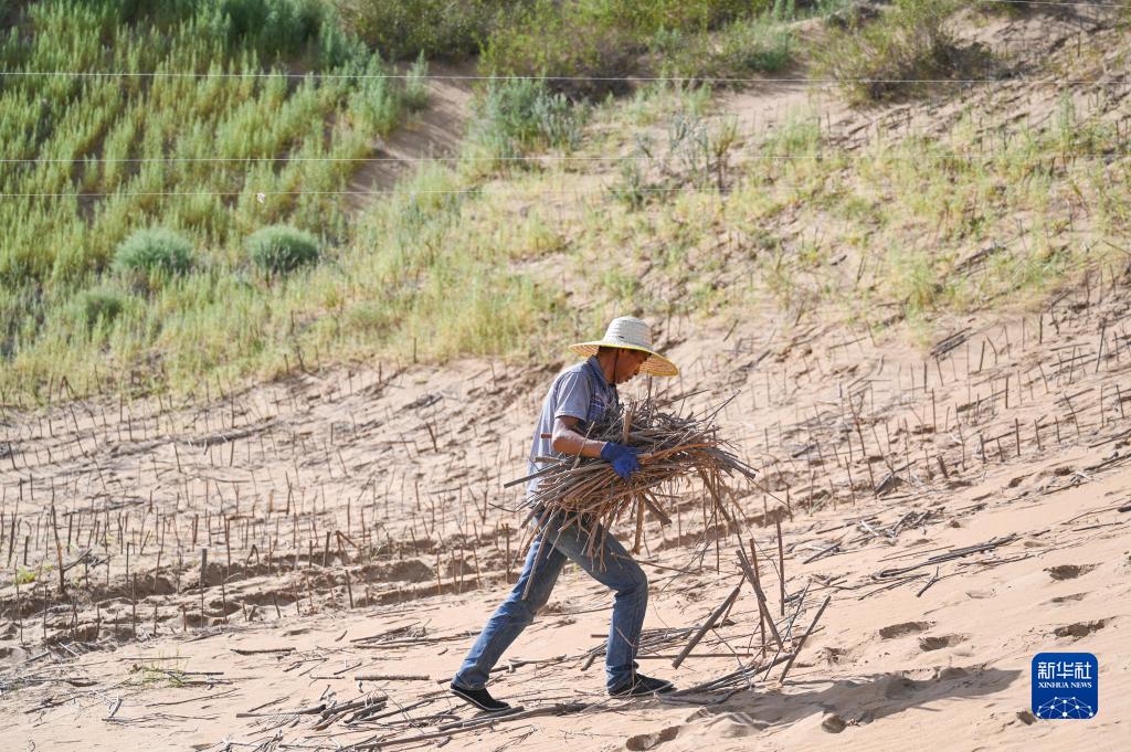 8月11日,工人在達拉特旗境內的庫布其沙漠中搬運沙障原材料——沙柳條。