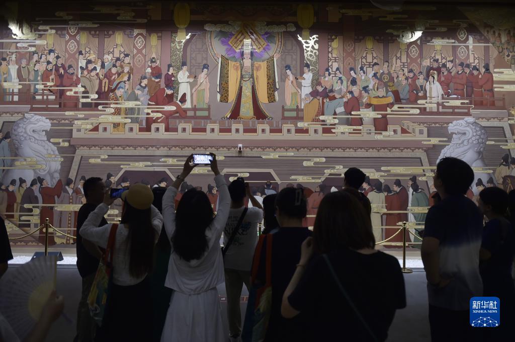 8月11日晚,游人在洛陽(yáng)應天門(mén)遺址博物館內觀(guān)賞壁畫(huà)。